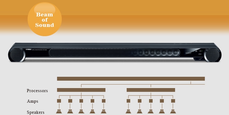 Advanced digital signal processing technology is absolutely essential for the YSP series to achieve multi-channel surround sound with sound beams. But that by itself is not enough to produce a high quality surround sound field. Generally, improving the degree of surround sound perfection is dealt with in the digital processing realm and the question of sound quality handled at the level of the speakers, but YSP is different. In YSP, increasing the performance of the speaker array itself results in a synergistic improvement of the surround sound field effect.