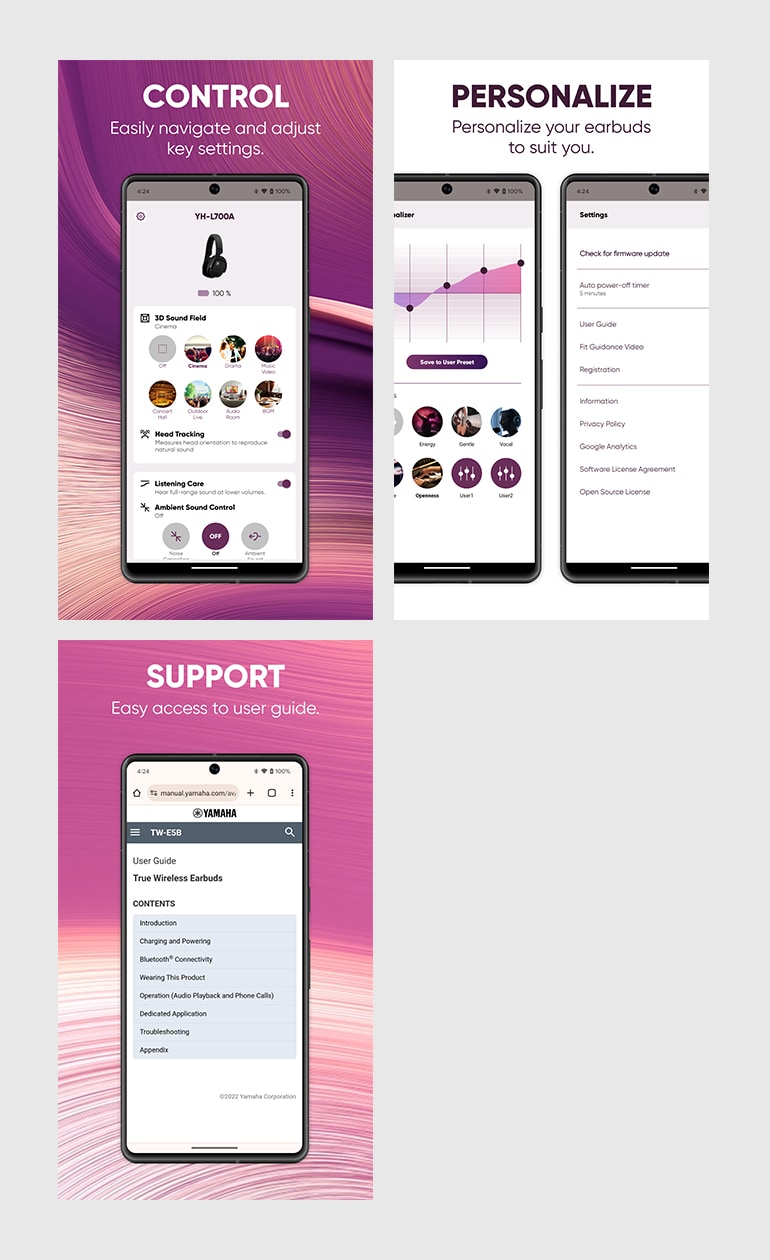 Adjust EQ and other modes with the companion Yamaha Headphone Control app for your smartphone.