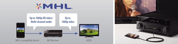 MHL permette una connessione semplice e diretta tra smartphone compatibili e il sintoamplificatore. Riproduzione video fino a 1080p e audio multi-canale dagli smarphone supportati. Il sintoamplfiicatore inoltre ricarica il dispositivo conensso. Le operazioni base come Play, Stop etc possono essere effettuate dal telecomando.