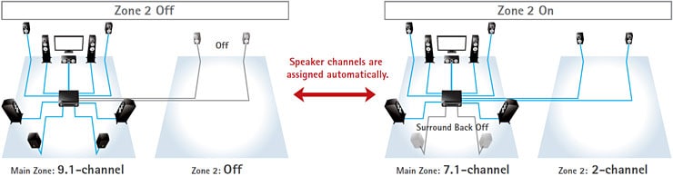 L'assegnazione intelligente degli amplificatori assegna automaticamente i canali amplificati a determinati diffusori a seconda delle funzioni selezionate. Per esempio in un sistema a 9.1 canali, quando la Zona 2 è disattivata, tutti i 9 canali vengono utilizzati nella zona principale. In ogni caso, quando la Zona 2 è attivata, i 2 canali surround back saranno diretti ai due diffusori della Zona 2 mentre nella Zona principale saranno attivi 7 canali. Similmente quando è attivo il CINEMA DSP 3D i due diffusori presenza frontali saranno attivi mentre i due surround posteriori non saranno attivi. Quando CINEMA DSP 3D è disattivato la situazione sarà rovesciata. Grazie all'Assegnazione intelligente degli amplificatori non è necessario cambiare i cavi dei diffusori dal pannello posteriore dei sintoamplificatore - un altro modo con cui Yamaha rende la vita più semplice.