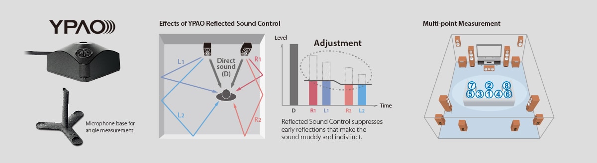 - YPAO™-R.S.C. sound optimisation with 3D, 64-bit precision EQ calculation and angle measurement