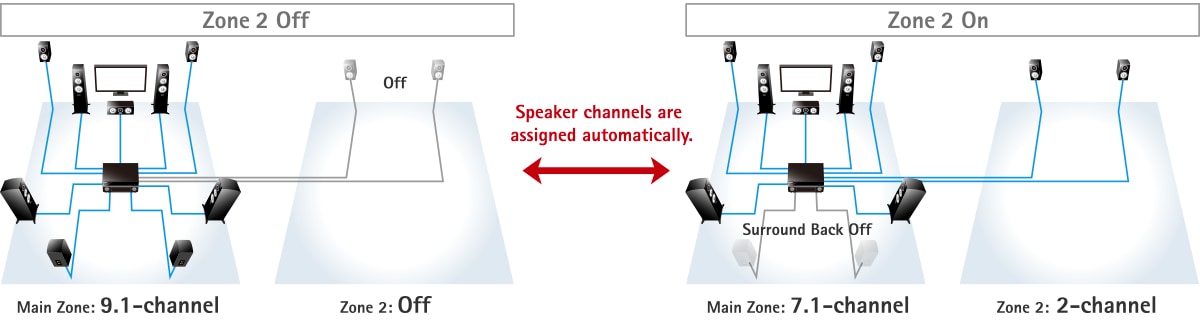 L'Intelligent Amp Assign assegna automaticamente i canali di amplificazione ad alcuni diffusori, in base alle funzioni selezionate. Ad esempio, in una configurazione 9.1 canali con la Zone 2 disattivata, tutti i 9.1 canali saranno utilizzati per la zona principale. Quando la Zone 2 è, invece, attiva, l'amplificazione dei due canali Surround Back sarà assegnata ai due diffusori della Zone 2 e la zona principale riceverà un'amplificazione 7.1 canali. Allo stesso modo, quando il CINEMA DSP 3D è attivo, verranno amplificati i due diffusori "presenza" posteriori invece dei due diffusori Surround Back. Avverrà il contrario quando il CINEMA DSP 3D è spento. Con Yamaha è tutto più semplice e grazie all'Intelligent Amp Assign modifiche alle connessioni sul retro del sintoamplificatore non sono più necessarie.