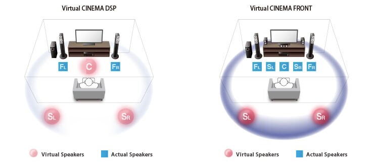 Quando non è possibile installare i diffusori surround dietro la posizione d'ascolto il Virtual CINEMA DSP riproduce reproduces virtual un sorrund a 5-canali realistio con solo due diffusori. Con la tecnologia Virtual CINEMA FRONT, potrete ascoltare un surround virtuale a 5-canali di elevata qualità e risoluzione installando i diffusori surround sulla parte frontale. Avrete più flessibilità nel posizionare i diffusori all'interno della stanza e maggiore qualità del surround.