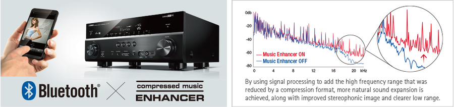 Questo sintoamplificatore AV è dotato di funzionalità Bluetooth che permette di riprodurre musica in wireless da smartphone e altri dispositivi. La tecnologia Yamaha Compressed Music Enhancer è stata ottimizzata per la trasmissione di audio in Bluetooth, per assicurare un suono vivo e coinvolgente anche nel caso di riproduzione senza cavi.