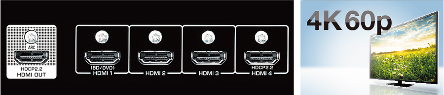 - HDMI (4 in/1 out) con HDCP2.2 (1 in/1 out), 3D e Audio Return Channel
