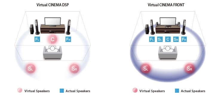 In assenza di diffusori surround posteriori, il Virtual CINEMA DSP riproduce un suono surround virtuale a 5 canali realistico con soli due diffusori. Con la tecnologia Virtual CINEMA FRONT, potrete ascoltare un surround virtuale a 5 canali di elevata qualità e risoluzione installando i diffusori surround sulla parte frontale. Avrete più flessibilità nel posizionare i diffusori all'interno della stanza, senza rinunciare alla qualità del suono surround.