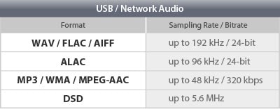 - Riproduzione di file DSD 2.8 MHz / 5.6 MHz, FLAC / WAV / AIFF 192 kHz / 24-bit, Apple® Lossless 96kHz / 24-bit