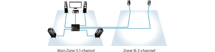 L'uscita Zone B permette al sintoamplificatore di amplificare con 2 canali una seconda zona, mantenendo 5 canali di amplificazione nella zona principale. Significa poter godere di un suono stereo in una seconda stanza. Entrambe le zone riproducono la stessa sorgente (non è possibile riprodurre due diverse sorgenti).