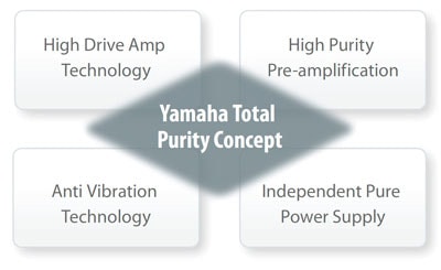 La progettazione di assoluta purezza del suono, che Yamaha persegue da molti anni, si esprime nella tecnologia di amplificazione ad alta corrente, nell'elevata purezza della pre-amplificazione, nella tecnologia anti-vibrazione e nelle alimentazioni separate. Tutti i modelli utilizzano amplificazioni a stadi separati che aiutano a ridurre la distorsione. Utilizzano, inoltre, alimentazioni separate per i circuiti analogici e digitali che impediscono al rumore digitale di nuocere ai circuiti analogici. I dissipatori anti-vibrazione sono progettati per eliminare le vibrazioni causate dai transistor e dalla pressione sonora. Su alcuni modelli, il rumore è ulteriormente ridotto dall'utilizzo di alimentazioni separate per i DAC. Questi sintoamplificatori sono curati nei minimi dettagli per massimizzare la resa della qualità sonora.