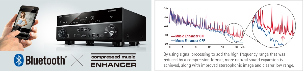 Questo sintoamplificatore AV è dotato di funzione Bluetooth per riprodurre facilmente musica in modalità wireless da smartphone e altri dispositivi. La tecnologia Compressed Music Enhancer di Yamaha è ora ottimizzata per la trasmissione audio Bluetooth e garantisce riproduzioni musicali in modalità wireless di grande impatto e qualità.