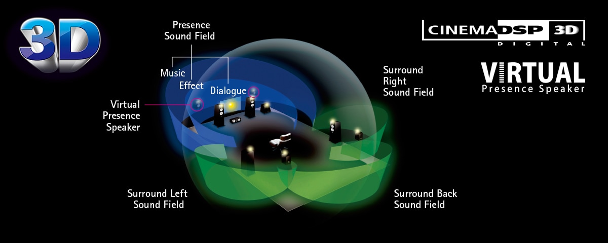 La funzione Virtual Presence Speaker permette di utilizzare i diffusori centrale e surround per ricreare diffusori "presenza" virtuali. Il CINEMA DSP 3D consente di godere dell'audio surround anche in ambienti con un limitato numero di diffusori. In aggiunta questo modello è dotato anche della funzione Virtual Surround Back Speaker. Anche in assenza di diffusori surround posteriori, questa tecnologia migliora l'esperienza di coinvolgimento del fronte posteriore.