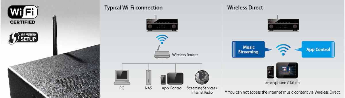 Il Wi-Fi integrato permette la connessione wireless al router di casa, semplificando la connessione per l'ascolto di musica in rete e tramite i servizi streaming. Nel caso non fosse presente un router Wi-Fi, la funzione Wireless Direct permette sia lo streaming della musica direttamente dallo smartphone o tablet al sintoamplificatore grazie alla funzione Music Play dell'app AV Controller, ad AirPlay di iOS, ecc., sia di controllare direttamente il sintoamplificatore utilizzando l'app AV Controller.