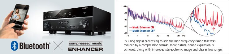 Questo sintoamplificatore AV è dotato di funzione Bluetooth per riprodurre facilmente musica in modalità wireless da smartphone e altri dispositivi. La tecnologia Compressed Music Enhancer di Yamaha è ora ottimizzata per la trasmissione audio Bluetooth e garantisce riproduzioni musicali in modalità wireless di grande impatto e qualità.