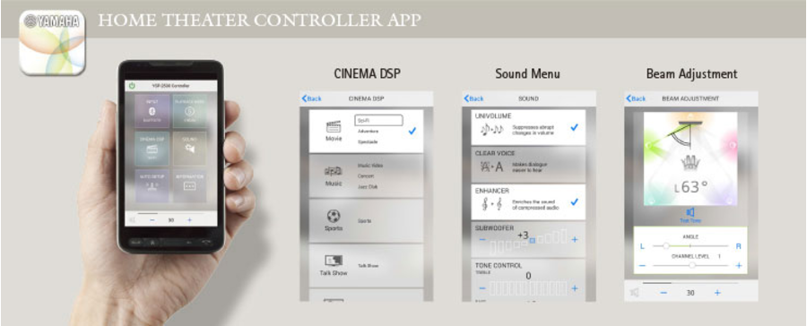 YSP-2500 è compatibile con l'applicazione gratuita HOME THEATER CONTROLLER per smartphone e tablet. L'interfaccia intuitiva utilizza delle icone che permettono di effettuare varie operazioni incluse la regolazione dei programmi surround o della qualità audio direttamente dallo schermo del dispositivo.