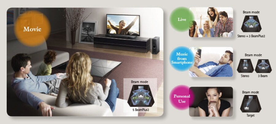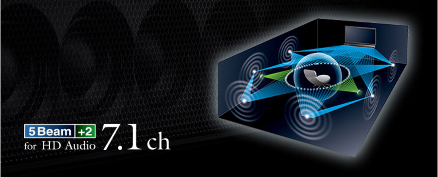 la YSP-2500 dispone di sei modalità raggi, da scegliere in base al migliore abbinamento con la sorgente musicale selezionata. Le modalità includono 5 Beam+2, in grado di riprodurre fedelmente un suono surround a 7.1 canali, 3 Beam, che ampia l'area di ascolto quando più persone ascoltano musica, oppure Stereo + 3 Beam, perfetto per DVD musicali. Utilizzando l'applicazione HOME THEATER CONTROLLER, è possibile effettuare regolazioni dettagliate all'angolazione dei raggi e al volume al fine di ottenere il suono desiderato.