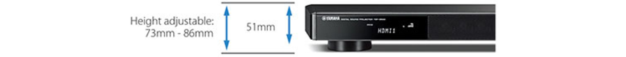 L'unità frontale, con i piedini di supporto, è alta solo 73 mm. Senza piedini di supporto l'altezza è di soli di 51 mm e permette di posizionare il YSP-2500 davanti alla TV senza coprire lo schermo. E' possibile appenderla a muro con la staffa opzionale SPM-K20.
