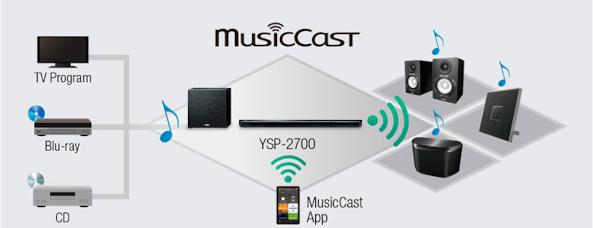 MusicCast utilizza una connessione wireless ad elevate prestazioni per riprodurre musica e altri contenuti audio. Effettua lo streaming della musica digitale da smartphone, PC o NAS ad altri dispositivi MusicCast presenti in casa. Può inoltre condividere l'audio di dispositivi esterni come TV o lettori BD connessi a YSP-2700. Anche i contenuti audio ricevuti via Bluetooth da smartphone o tablet possono essere distribuiti ai dispositivi MusicCast presenti nelle varie stanze.