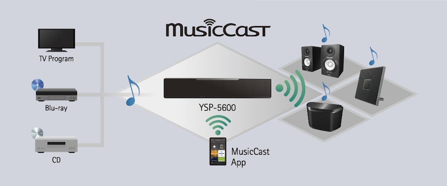 MusicCast employs a high performance wireless network to deliver music and audio enjoyment. It can stream digital music content from your smartphone, PC or NAS to other MusicCast devices in your home. It can also share the music from external devices such as a TV or Blu-ray player connected to the YSP-5600. Audio content from Bluetooth-connected smartphones or tablets can also be streamed to MusicCast devices in multiple rooms. All MusicCast models support Bluetooth. Not only can you enjoy streaming all content from your smartphone including content from video hosting services and music applications, but you can also distribute audio to other rooms. In addition, a wide range of sound source s are supported including MP3, WMA, AAC, Apple Lossless, WAV, FLAC and AIFF.