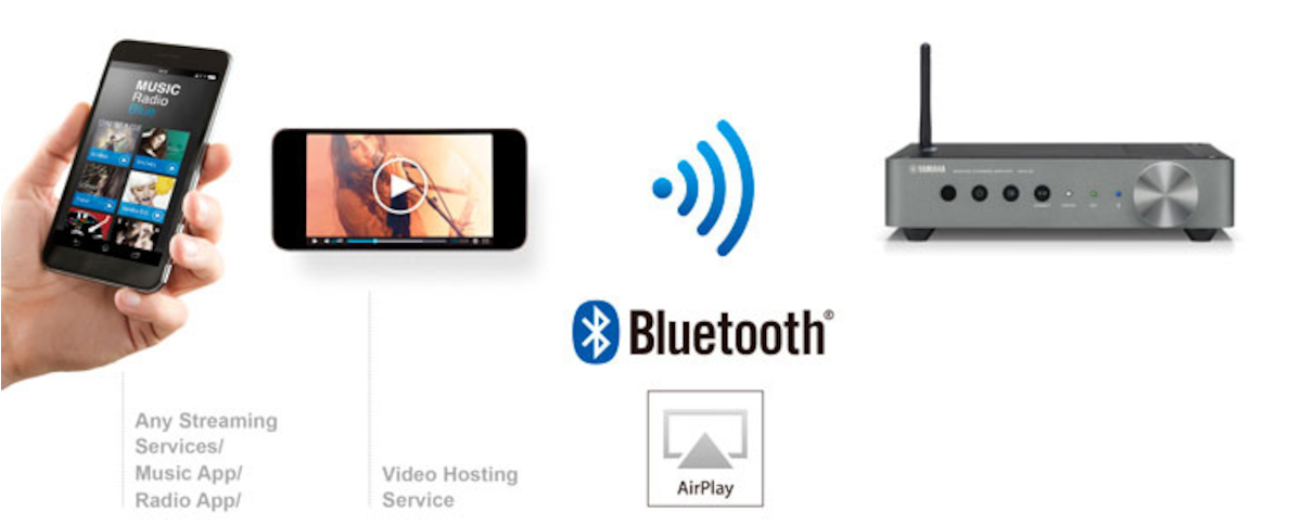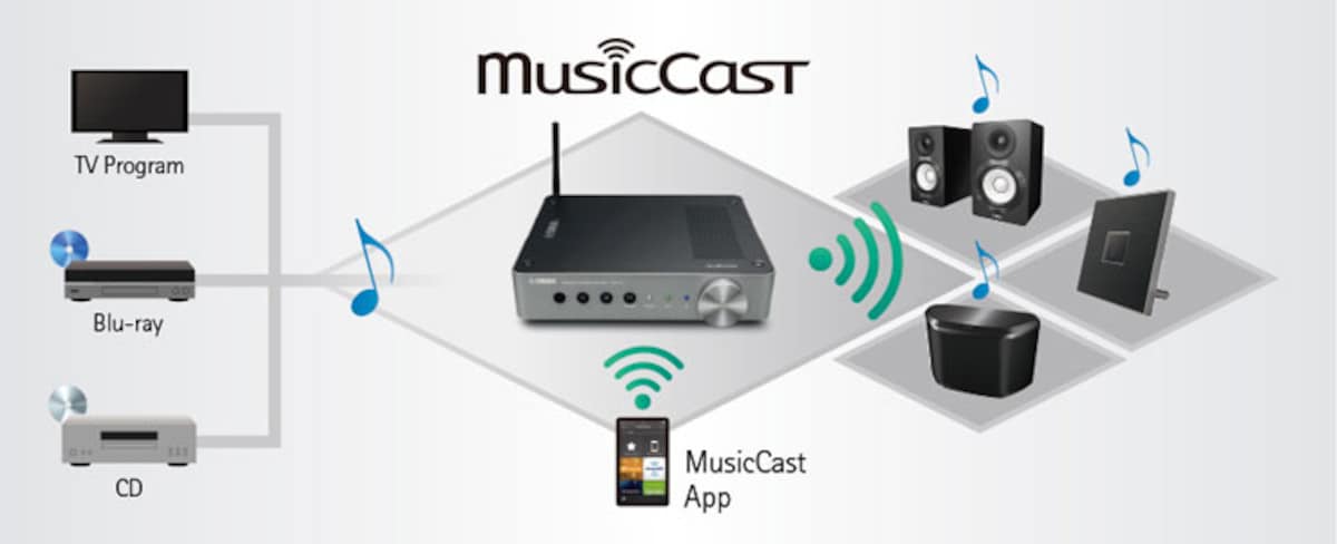 MusicCast utilizza un network wireless ad elevate prestazioni per riprodurre musica e altri contenuti audio. E’ in grado di effettuare lo streaming digitale di musica da smartphone, PC o NAS ad altri dispositivi MusicCast presenti a casa. Può inoltre condividere l'audio di dispositivi esterni come TV o lettori Blu-ray Disc™ connessi al sintoamplificatore RX-A3060. Anche i contenuti audio ricevuti via Bluetooth® da smartphone o tablet possono essere inviati in streaming ai dispositivi MusicCast presenti nelle varie stanze.