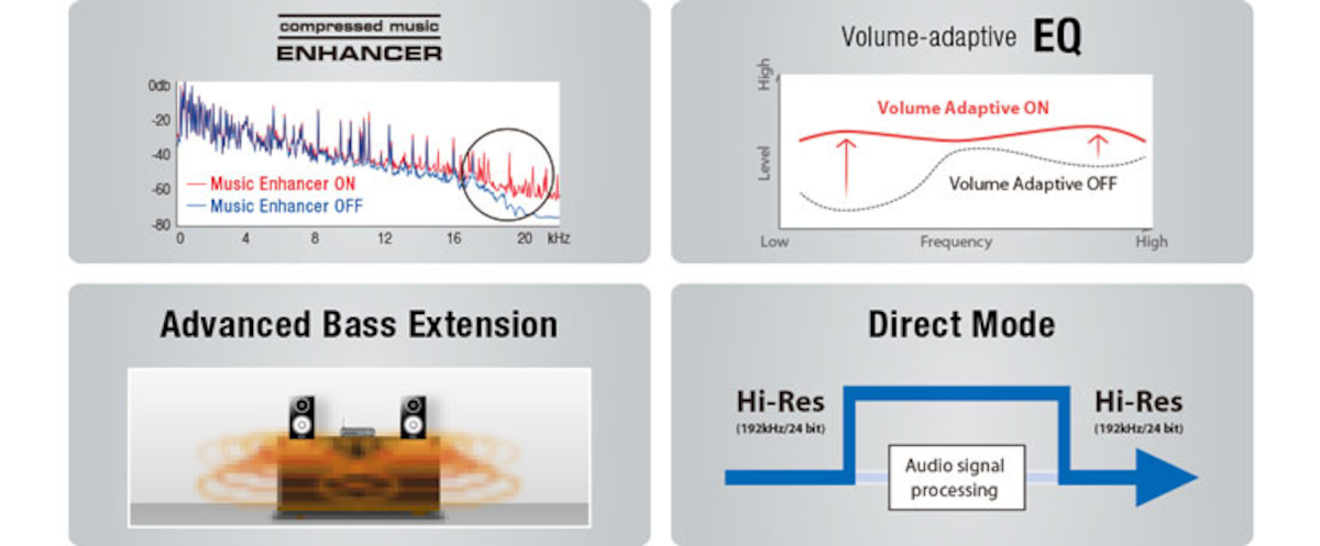 Grazie alle tecnologie superiori di Yamaha potrai godere delle tue sorgenti musicali preferite non importa la qualità, l’ambiente e gli speakers utilizzati. Quando ascolti l’audio dal tuo smarthphones o di altre sorgenti musicali compresse, il Compressed Music Enhancer migliora i livelli di frequenza. La funzione Volume-adaptive EQ aggiusta automaticamente il bilanciamento dei bassi e degli alti. La funzione Advanced Bass Extension fornisce profondi e precisi bassi. La funzione Direct Mode permette di riprodurre sorgenti di alta qualità come se non avessero subito nessun processo.