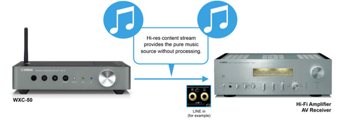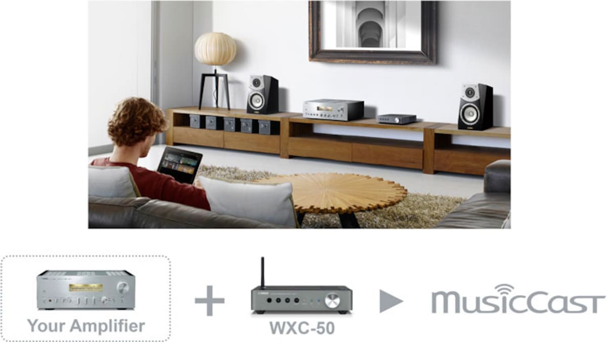 Anche se il tuo amplificatore Hi Fi o il tuoi sintoamplificatore AV non è compatibile MusicCast semplicemente aggiungendo il tuo WXC-50 potrai godere del tuo network audio MusicCast multiroom collegandoli insieme.