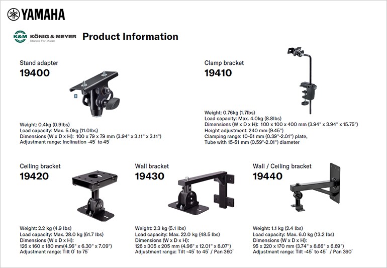 Fondata nel 1949, König & Meyer è un'azienda leader a livello mondiale nella produzione di supporti per microfoni, altoparlanti e strumenti musicali, che offre una gamma di staffe e supporti di alta qualità e durata, pienamente compatibili con i prodotti Yamaha.