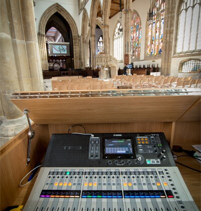 Covering the full length of the Nave and the chancel, the Dante network forms the backbone of a Yamaha audio system comprising a Yamaha TF3 digital mixer, a pair of TIO1608-D stage boxes and an MTX5-D matrix processor.