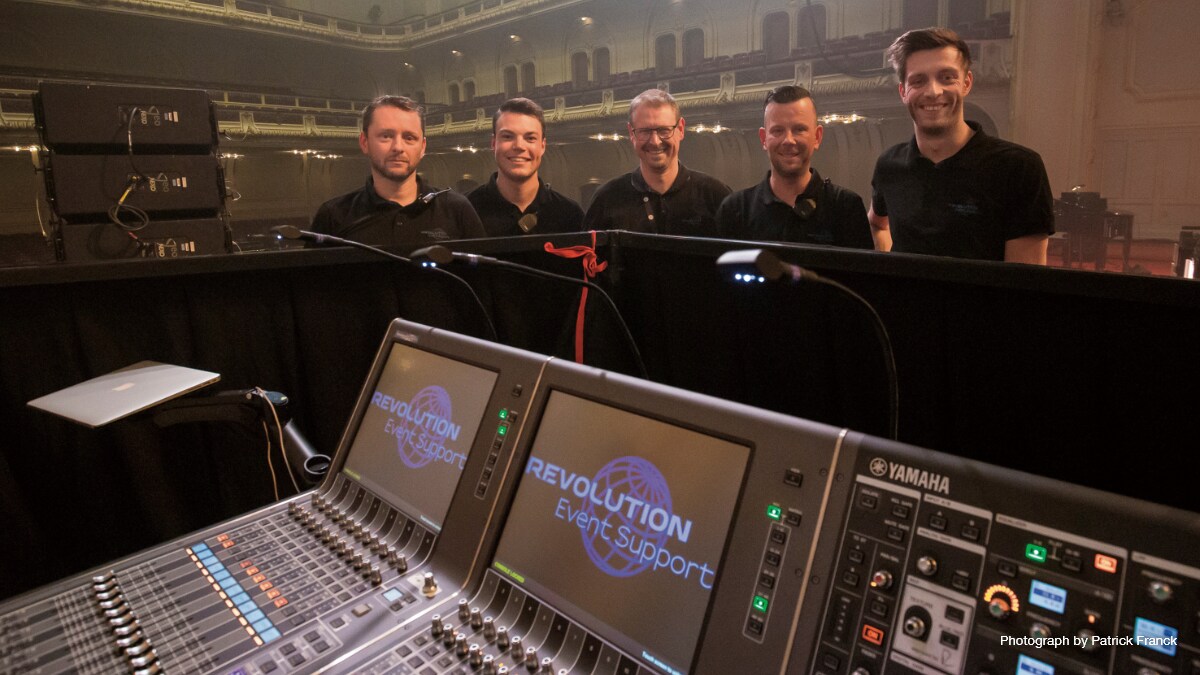 Kristof Haagdoren (monitor engineer), Stef Schrijvers (system tech), Bart Faut (FoH engineer/production manager). Michael Nijs (backline tech) and John Hellinx (stage audio & RF engineer) with the RIVAGE PM7