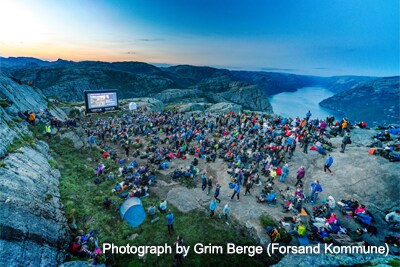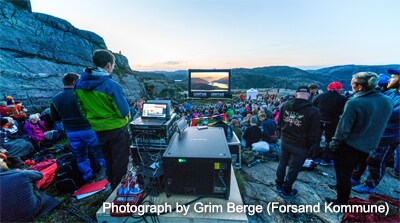 One of the most iconic scenes of the film Mission Impossible - Fallout is the fight between Tom Cruise and Henry Cavill on an imposing cliff edge. It was filmed at the Preikestolen (the Pulpit), a large rock outcrop in the mountains above Lysefjorden in Forsand, Norway… so where better for the film’s Norwegian première to take place? The event was hosted by Forsand Kommune, but a major problem was how to deliver high quality cinema sound to 2000 people on a mountain, 600 metres above sea level?
