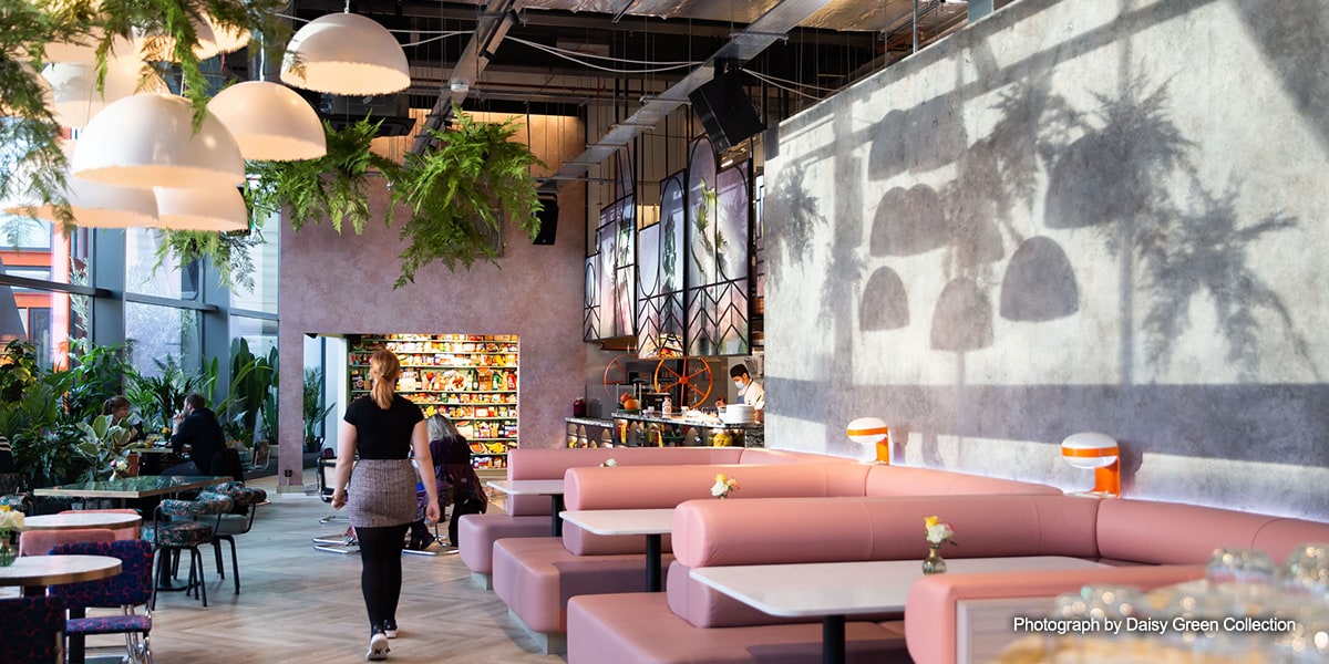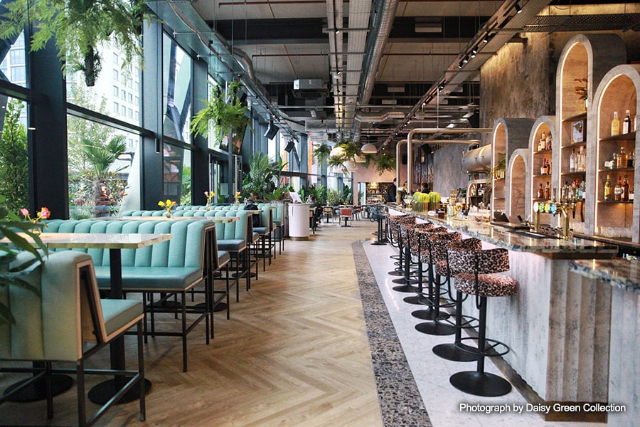 Founded by Prue Freeman and Tom Onions in 2012, Daisy | Green has developed an attractive range of premises throughout London, each individually designed to make it a unique experience for customers. Completed in 2019, the Brunel Building’s 16 floors and 22,610㎡ of office space gave Prue and Tom the opportunity to establish a larger, more permanent restaurant close to its existing Darcie & May | Green restaurant, a pair of converted narrowboats which float on the adjacent Grand Union Canal.