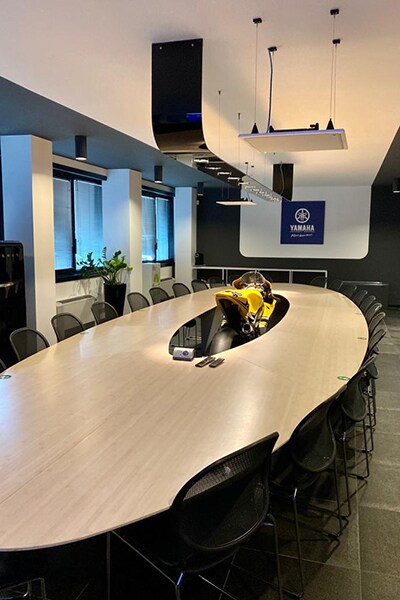 Named after three-time 500cc Grand Prix world champion Wayne Rainey, the ‘Wayne Rainey Board Room’ hosts YMR’s most important meetings. It features a 24-seat oval table which encircles one of the most iconic Yamaha bikes ever ridden: Yamaha’s 50th anniversary-liveried YZR-M1, ridden by seven-time MotoGP world champion Valentino Rossi in 2005 at Laguna Seca (USA).