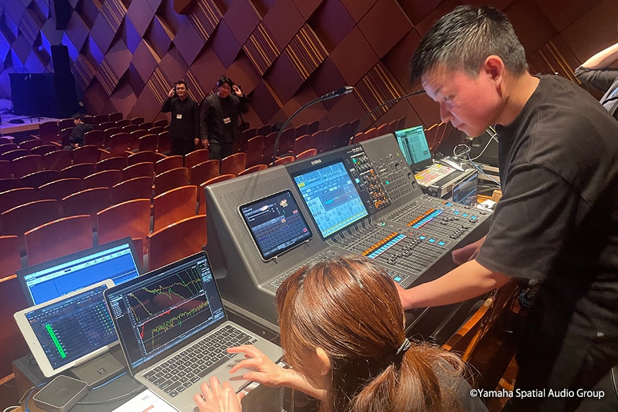 The recordings submitted by the amateur musicians were mixed on a RIVAGE PM3 digital mixing system and consolidated into 15 object-based audio tracks. Along with the live vocal and keyboard performance by Sukima Switch, they were rendered with AFC Image, distributed via a Dante network and routed through an immersive system of 28 Yamaha DZR series and two DXR series powered loudspeakers. A Yamaha QL5 digital mixing console was also used to provide in-ear monitor mixes for Sukima Switch and for a stereo downmix, which was streamed online.
