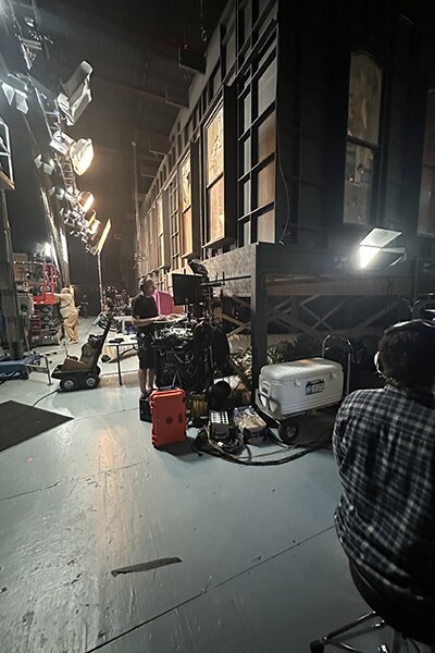 It’s just past 7 a.m. in Wilmington, North Carolina, and the set of The Runarounds is already humming with energy. Inside a brick-walled warehouse turned makeshift club, extras sip coffee, cameras glide on tracks, and a band of guitar-strapped young actors tunes up under stage lights. Cables snake across the floor, lighting rigs buzz overhead —and just off-stage, tucked behind a curtain of black duvetyn, audio and recording engineer Scott Steiner is deep in concentration at his rolling cart, earbuds in, fingers flying across a console.
