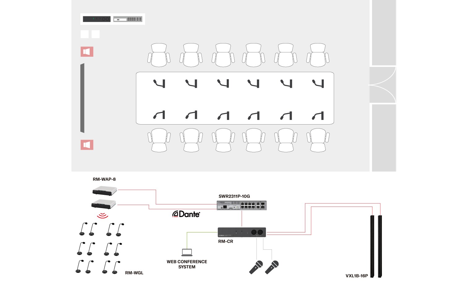 In molte aziende, ci sono grandi sale riunioni in cui si tengono riunioni con partecipanti che si collegano da diverse parti del mondo. Tutti vogliono essere ascoltati chiaramente in questi incontri. ADECIA offre più opzioni per soddisfare queste esigenze. È possibile utilizzare microfoni a soffitto o microfoni da tavolo cablati. Se vuoi essere molto flessibile, puoi utilizzare il sistema microfonico wireless RM-W di Yamaha. Insieme al processore di conferenza RM-CR, agli altoparlanti VXL1-16P e allo switch SWR2311P-10G, RM-W costituisce la soluzione audio wireless ADECIA all-in-one. Fino a 16 microfoni wireless offrono la migliore esperienza di conferenza e riunione e assicurano che ogni partecipante sia ascoltato.