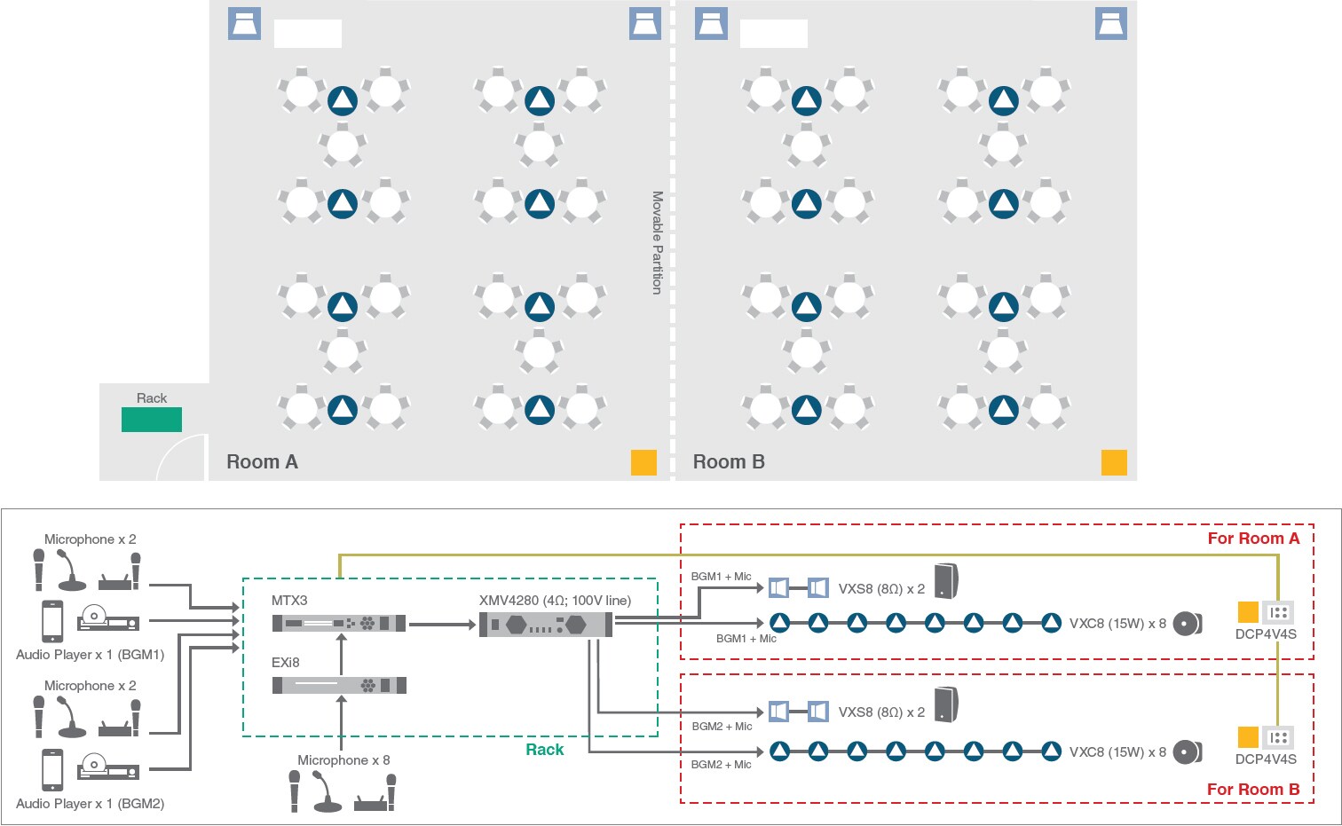 Flexible Space Utilization for a Variety of Events “We have a number of rooms that are normally used separately, but for special events we want to be able to combine them by removing the partitions without having to change the sound system layout or equipment.”This is a fairly common hotel banquet room or multi-purpose hall scenario that can be effectively served by the following system. Room A and Room B in the system example are normally used independently for meetings, parties, or other events, and are therefore equipped with audio systems that can be operated separately. The Yamaha MTX3 is a convenient matrix processor that can accept input from multiple audio sources and microphones and route that audio to specified speaker systems. The EXi8 is handy when you want to increase the number of available microphone inputs, for example. DCP4V4S control panels installed in each room can be set up to allow remote control of microphone level and on/off switching, that are flexibly set as required with the MTX-MRX Editor software. When the partition is removed and the rooms are combined to form one larger space, an appropriate setup that has been pre-programmed using the MTX-MRX Editor can be recalled via a single button, instantly setting up the system for central control.