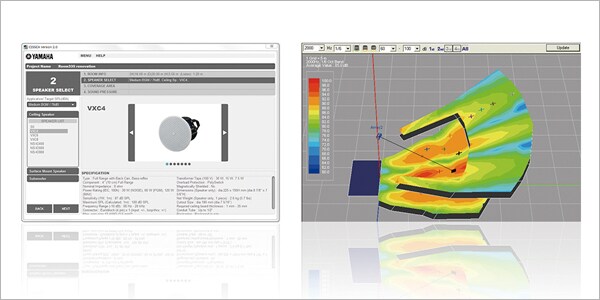In addition to EASE and CLF data that are widely used for sound system design, data is available for dedicated Yamaha speaker software applications. CISSCA, the Commercial Installation Solutions Speaker Calculator, is a software application that rapidly calculates the number of speakers required for optimum performance in installations, which is ideal for basic installations such as in-store BGM systems. The Yamaha Sound System Simulator (Y-S3) is a software application that provides accurate simulations of acoustic spaces, which is ideal for more complex installations such as hall sound systems.