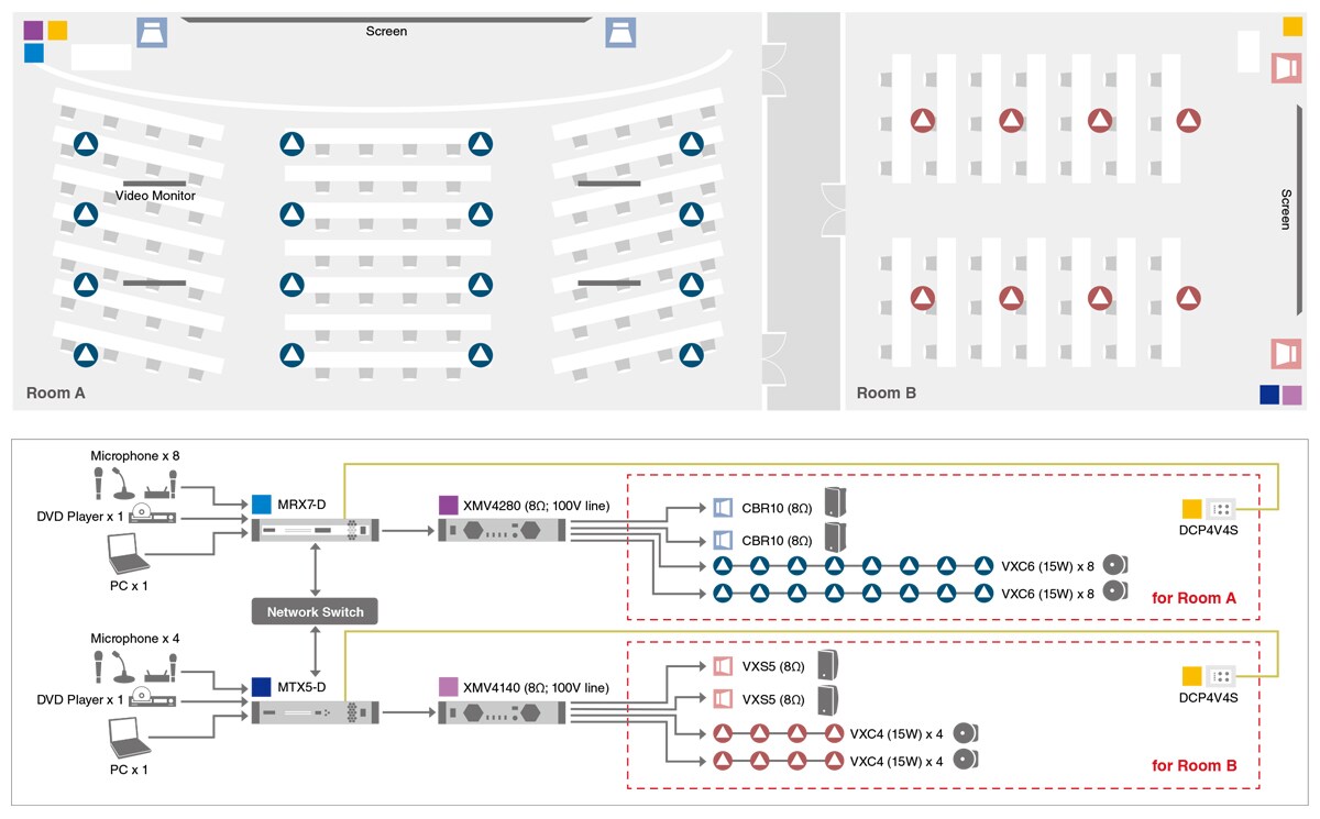 DCP4V4S control panels installed in each room allow remote control of audio source and microphone levels as well as on/off switching.