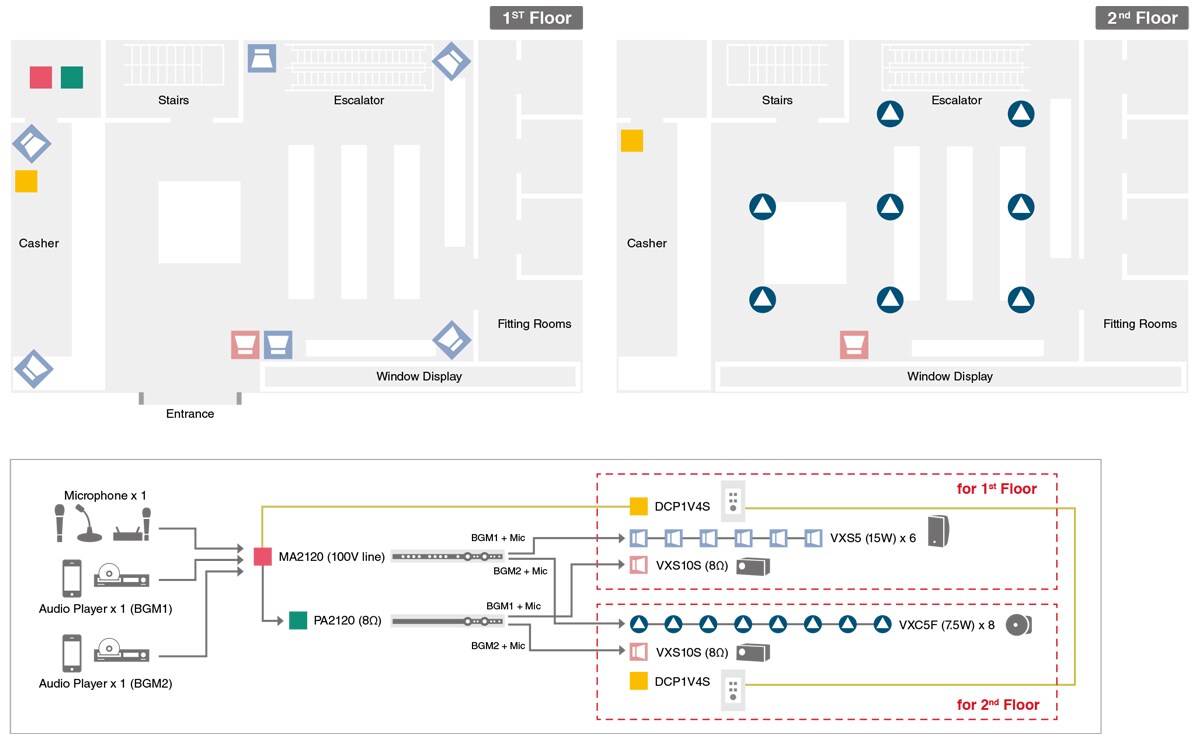 The MA2120 would be a good choice for broadcasting announcements or advertisements while supplying different background music to different areas. It includes a Ducker function that automatically reduces the volume of the background music while a microphone is being used so that no manual adjustments are required. DCP1V4S control panels installed in the separate areas allow remote control of background music volume and other operations