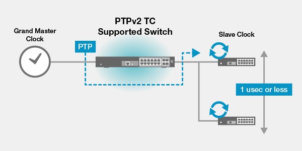 All newly released switches support IEEE 1588 PTPv2 TC (Transparent Clock) to provide the high-precision time synchronization required for applications such as the synchronized playback of audio and video media.