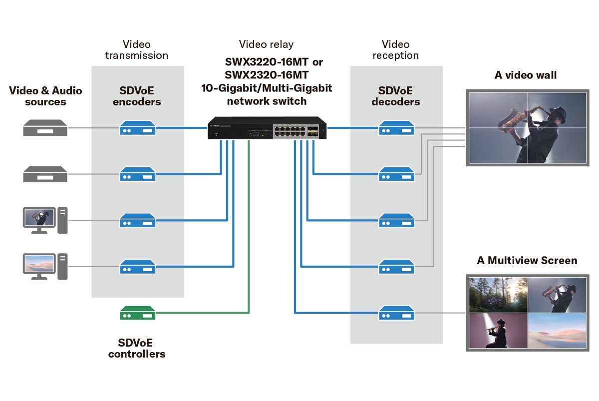 By combining Yamaha network switches with SDVoE encoders, decoders, high resolution video/audio sources, monitors and other equipment, high quality AV content can be transmitted over distance.