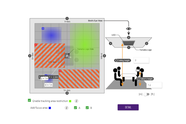 Per la soluzione a soffitto ADECIA, abbiamo aggiunto una scelta di 2 aree di focalizzazione e 2 aree di esclusione per creare zone speciali per il rilevamento del suono. È possibile definire facilmente una "Area di Tracciamento" personalizzata per un rilevamento audio più preciso. Gli utenti possono ora preimpostare le zone di tracciamento del fascio di RM-CG utilizzando un sistema di codici colore nell'interfaccia utente web.