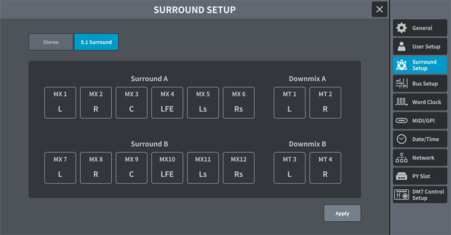 L'ultimo firmware DM7 versione 1.60 aggiunge il controllo remoto ad AFC Image, il sistema immersivo Yamaha basato su oggetti, creando flussi di lavoro efficienti per esperienze audio immersive in contesti live. Aggiunge inoltre il panning e il monitoraggio surround 5.1 all'espansione del pacchetto Broadcast del DM7.