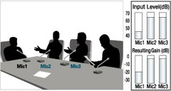 Quando due persone parlano contemporaneamente il guadagno viene distribuito allo stesso modo tra i due microfoni attivi mantenendo costante il guadagno totale, mentre il guadagno degli altri microfoni viene attenuato.
