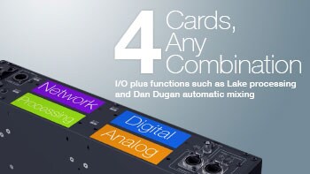 Con l'RSio64-D è possibile utilizzare oltre 30 tipi di schede Mini-YGDAI. Non solo schede di I/O che gestiscono formati come AES/EBU o ADAT, ma anche schede di elaborazione che forniscono funzionalità come l'elaborazione Lake e il mixaggio automatico Dan Dugan.