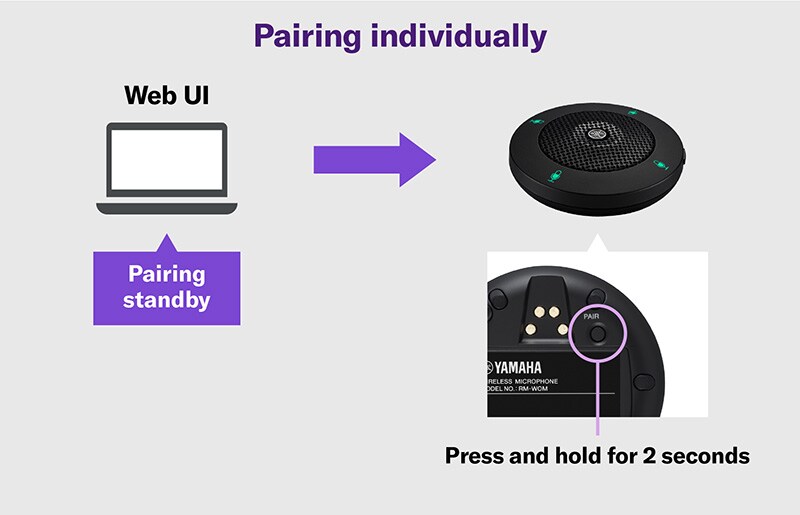Ogni microfono può essere facilmente accoppiato dall'interfaccia web. È possibile accoppiare il microfono individualmente, o accoppiare più microfoni sul caricatore del microfono in una sola volta. Il sistema può anche essere monitorato in remoto tramite un'interfaccia utente web.