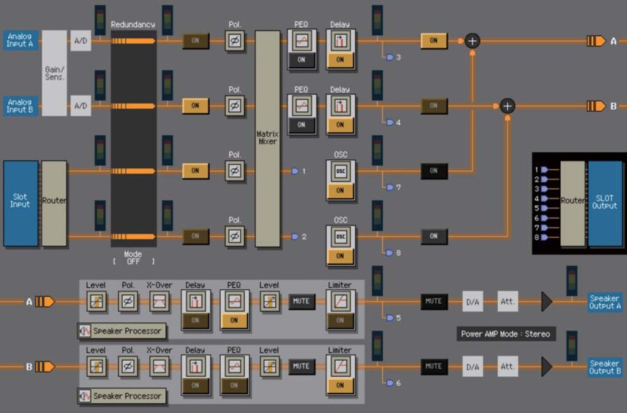 Funzioni Input Routing e Processing: card input routing , Mute, Polarità, Livello, matrix mixer 4-in/4-out, Delay, EQ (8 bande per ogni canale input; PEQ 6 bande e EQ due bande selezionabili) Speaker processing: Level Mute, Polarità, Crossover (LPF/HPF), Delay, EQ (6 bande per ogni canale input), Limiter, Controllo e settaggio Speaker Library Amplifier: Power on/off, Mute, Input attenuator, Gain/sensitivity, selezione Input, modalità Signal redundancy, modalità Amplifier (Stereo, Bridge, Parellel), Input Mixer, Attenuator linked limits, misuratori selezionabili, Limiter settings Protection: limitatore del voltaggio, limitatore di potenza, limitatore surriscaldamento, Low impedance/short circuit mute, Output DC mute, limitatore VHF, limitatore Current