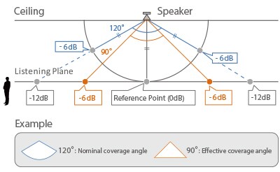 È importante notare che l'angolo di copertura nominale elencato nelle specifiche del diffusore da soffitto non è realmente quello effettivo. Il SPL dell'angolo di copertura nominale è di 6 dB più basso che sull'asse SPL misurato a una distanza costante dal diffusore. L'angolo di copertura effettivo è definito come l'angolo a cui il SPL è più basso di 6 dB del SPL sull'asse frontale d'ascolto. L'angolo di copertura effettiva è normalmente circa il 70-80% dell'angolo di copertura nominale. I calcoli CISSCA sono basati su angoli di copertura effettivi.