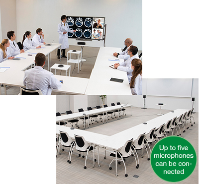 - Eccellente soluzione flessibile per grandi sale riunioni con configurazioni speciali dei tavoli, con possibilità di collegare in daisy chain 5 microfoni e supportare 2 diffusori esterni