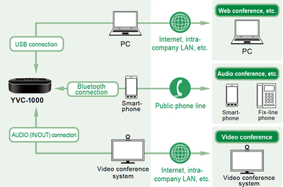 Puoi collegarti al sistema YVC-1000MS tramite USB, Bluetooth*1 o i terminali audio*2 di un sistema per conferenze, per un audio di alta qualità in conferenze e riunioni. La gamma di opzioni di connessione permette di adattarsi rapidamente a una varietà di ambienti di comunicazione, nonché a situazioni in cui le conferenze potrebbero risultare difficili a causa della mancanza di una linea fissa o di problemi di connettività Internet.