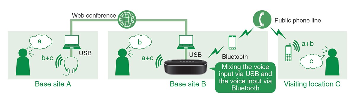 La funzione di mixaggio dell'audio combina più sorgenti di ingresso vocale connesse a ciascuna interfaccia (USB, Bluetooth e ingresso/uscita audio), consentendo la comunicazione simultanea su linee diverse. Ad esempio, se sei connesso a una conferenza Web tramite USB, puoi includere altri partecipanti tramite smartphone utilizzando una connessione Bluetooth, sfruttando la funzione di mixaggio dell'audio per combinare le sorgenti audio.